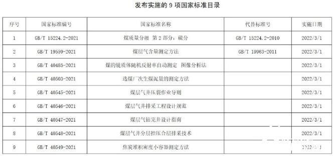 此次發(fā)布實施的煤炭領域國家標準中,《煤層氣含量測定方法》《煤層氣井壓裂作業(yè)導則》《煤層氣井排采工程設計規(guī)范》《煤層氣鉆完井設計指南》《煤層氣井分層控壓合層排采技術規(guī)范》等5項標準,將為我國低階煤煤層氣地質勘探與資源潛力評價和開發(fā)提供指導,優(yōu)化我國復雜地質條件地區(qū)煤層氣開發(fā)技術方案,推動煤層氣資源開采利用的最大化?!睹旱溺R質體隨機反射率自動測定 圖像分析法》《選煤廠次生煤泥量的測定方法》《焦炭堆積密度小容器測定方法》等3項方法標準,為煤炭資源評價、商品煤質量監(jiān)管等方面提供有力支撐。《煤炭質量分級 第2部分:硫分》對于科學評價煤炭資源中的硫分、指導煤炭生產(chǎn)和加工利用有著重要意義。