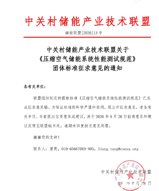 中關(guān)村儲(chǔ)能產(chǎn)業(yè)技術(shù)聯(lián)盟關(guān)于《壓縮空氣儲(chǔ)能系統(tǒng)性能測試規(guī)范》團(tuán)體標(biāo)準(zhǔn)征求意見的通知