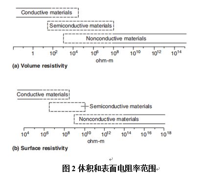 材料的電阻率通常由體積和表面成分組成。在靜電過程中,定義材料為絕緣材料、半導(dǎo)體材料或?qū)щ姴牧系碾娮杪实慕品秶鐖D6.7所示。