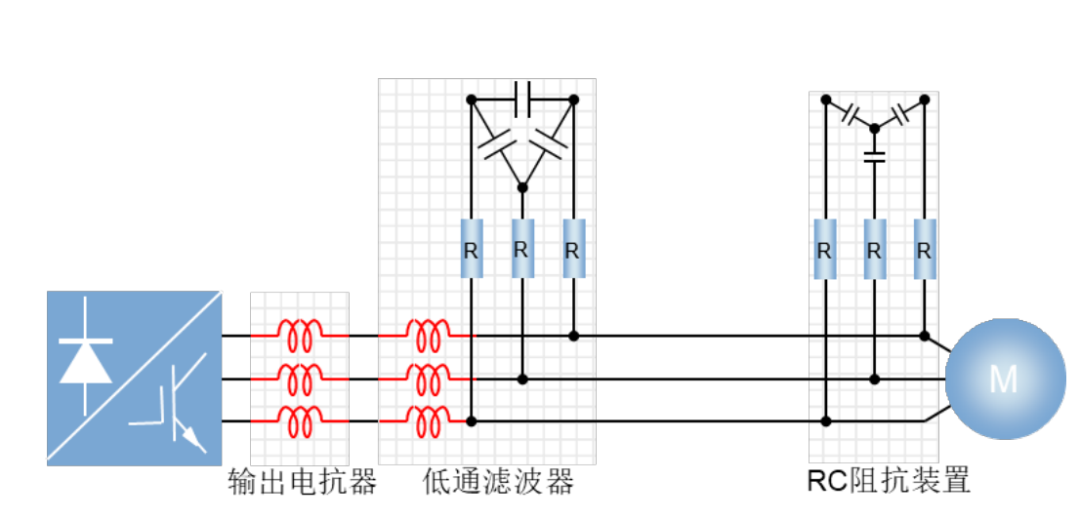 變頻器輸出端,安裝低通濾波器。 變頻器輸出端,串聯電抗器。 電機端,并聯RC阻抗。