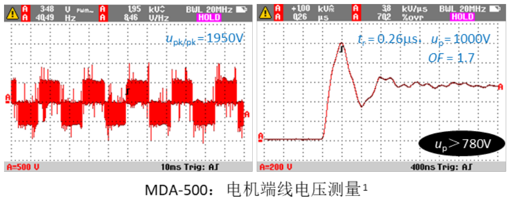 案例:某集團企業(yè),使用的水泵是普通工頻電機,由變頻器控制。意外發(fā)生了電機損毀。變頻器與電機間的電纜長度為20m。以下是MDA 500測量結果。
