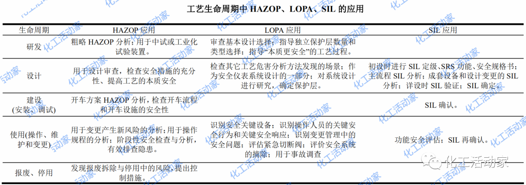 工藝生命周期分為工藝(裝置)研發(fā)、設(shè)計(jì)、建設(shè)、使用與報(bào)廢等主要階段,各階段中風(fēng)險(xiǎn)管理的重點(diǎn)和方式均有不同,HAZOP、LOPA、SIL技術(shù)的應(yīng)用也有所不同。