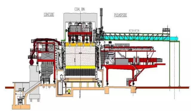 煤塔配煤——按比例配合不同煤種, 使配合煤達到符合煉焦用煤的要求, 配煤倉為直徑8米的雙曲線斗嘴倉7個。每個倉的儲量約為500t。煤倉雙曲線鋼漏斗內襯超高分子塑料板,防止棚料。倉下配煤設備采用配料穩(wěn)定, 配比準確, 自動化程度高的電子自動配料秤, 系統(tǒng)控制為PLC 控制。粉碎——選用可逆反擊錘式粉碎機PFCK兩臺, 其單臺破粹能力為250t/h, 一開一備。該粉碎機是在吸收德、日同類設備先進技術開發(fā)而成, 具有破碎比大、能力大、轉速低、粉塵少、對煤的水分適應性強等優(yōu)點;采用液力偶合器, 能有效防護過載且能軟啟動;機體外殼開閉與反擊板調節(jié)均采用液壓裝置, 檢修及更換錘頭方便;采用組合式錘頭, 使用壽命長,維護、檢修費用低, 節(jié)約生產成本。 配煤煉焦——是把幾種牌號不同的單種煤按—定的比例配合起來煉焦。a、節(jié)約優(yōu)質煉焦煤,擴大煉焦煤源;b、充分利用各種煤的結焦特性取長補短,改善冶金焦炭質量;c、也能合理利用煤炭資源,在保證焦炭質量的前提下,增加煉焦化學產品的產率和煉焦煤氣的發(fā)生量;d、充分利用本地資源,因地制宜發(fā)展焦化企業(yè)。配煤工藝——包括兩種:即先粉后配和先配后粉,大多數(shù)焦化廠包括我公司的焦化廠都采用后者。a、焦炭質量達到規(guī)定指標,滿足使用部門的要求;b、不會產生對爐墻有危害的膨脹壓力和引起推焦困難;c、在滿足焦炭質量的前提下,盡量多配氣煤,增加化產品產率,盡量少配優(yōu)質煤,多配劣質煤; e、充分利用本地資源,作到運輸合理,降低成本,最大限度實行區(qū)域配煤;f、力求達到配煤質量穩(wěn)定,有利于生產和操作。配合煤的質量要求——水分9~12%;灰份≤10%;硫份≤0.9%;揮發(fā)24~30%;粉碎細度( 煤料被粉碎后,omm~3mm粒度級的煤的重量占全部煤料重量的百分數(shù)稱之為配煤的細度)在90%左右;G值≥68;Y值12~20 煉焦原理——配合煤的高溫干餾。即把煉焦配煤在常溫下裝入炭化室后,煤在隔絕空氣的條件下受到來自爐墻和爐底(1000℃一1100 c)的熱流加熱。煤料即從炭化室墻到炭化室中心方向,一層一層地經過干燥、預熱、分解、產生膠質體、膠質體固化、半焦收縮、轉變?yōu)榻固康倪^程。