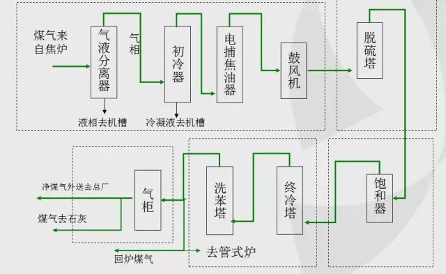 為了降低洗油中的含萘量,脫苯塔中部進行側線采萘,萘油流入萘揚液槽,用蒸汽壓出送冷鼓機械化氨水澄清槽。外購來的新洗油卸入新洗油地下槽后, 再用新洗油地下槽液下泵送入貧油槽,作循環(huán)洗油的補充。由終冷塔冷凝所得的煤氣冷凝液由冷凝液輸送泵送至冷鼓工段。 來自洗脫苯的凈煤氣經進氣柜水封進入儲量2.3萬m3,從氣柜出來的煤氣經出氣柜水封進羅茨風機加壓到5~15KPa,大部分送總廠作為燃氣使用,另一部分送到石灰作業(yè)區(qū)作為石灰窯用燃料。該焦化廠氣柜為浮頂式氣柜,有效高度為21.2m,安全高度為7~18m。上圖所示是焦化廠主要生產產品,整體分析由以下幾個部分組成: