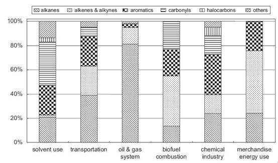 2、VOC貢獻(xiàn)最大的污染源有固定源燃燒、交通源、溶劑應(yīng)用、化工生產(chǎn)和存儲(chǔ)、石油儲(chǔ)運(yùn)和精煉、混雜源等。每種污染源的成分(烷烴、烯炔烴、芳香烴、羰基化合物、鹵代烴及其他)有所不同,根據(jù)資料各種源的成分比例如下: