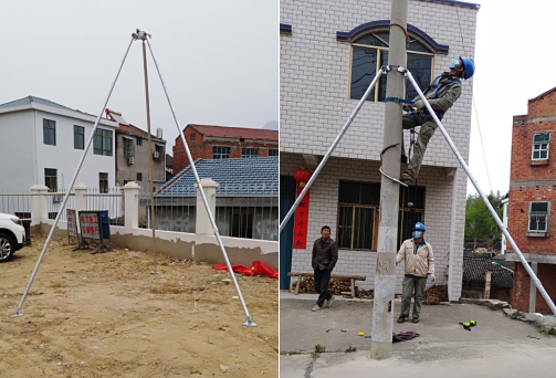 用操作桿將兩個半圓抱箍固定至電桿距地面約2/3處,相互扣入并卡緊,然后在抱箍的四個拉環(huán)上分別裝設四根拉線固定在地面,防止倒桿。