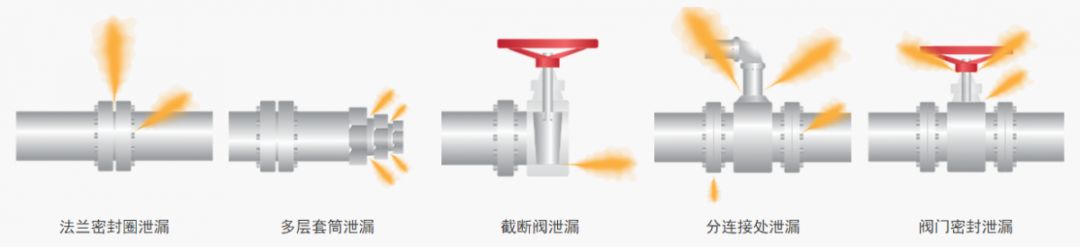 常見的氣體泄漏點(diǎn)有:法蘭密封圈、多層套筒、截?cái)嚅y、分連接處、閥門密封。