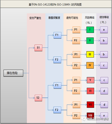 風(fēng)險(xiǎn)因素 S = 受傷嚴(yán)重度 受傷嚴(yán)重度說(shuō)明: F=在危險(xiǎn)區(qū)域內(nèi)停留的頻率和時(shí)間(曝露在危險(xiǎn)下) 風(fēng)險(xiǎn)等級(jí)(RL)通過(guò)羅馬數(shù)字來(lái)表達(dá)(I到VIII)。同時(shí)會(huì)確定績(jī)效等級(jí)(PL),PL表達(dá)了不同機(jī)器所采用的為改善風(fēng)險(xiǎn)所采取的安全措施的整合度。