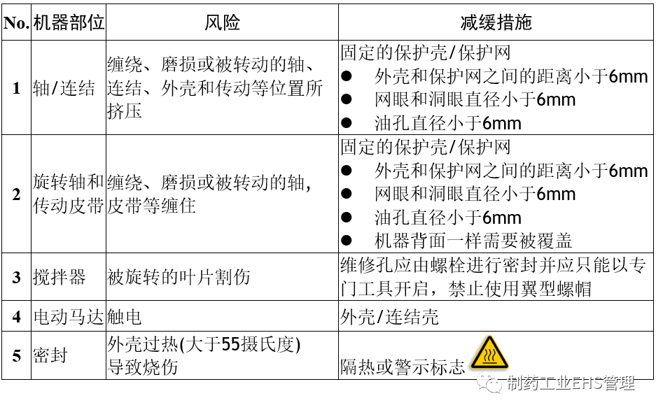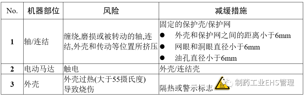 本附錄中包含了對(duì)于簡(jiǎn)單機(jī)器所適用的一般化風(fēng)險(xiǎn)評(píng)估。簡(jiǎn)單機(jī)器可以被分成以下類別:①泵、真空泵;②壓縮機(jī);③風(fēng)扇;④攪拌器(缸體或柜體上擁有在正常運(yùn)行時(shí)封閉著的檢修孔的攪拌器可以被認(rèn)為是簡(jiǎn)單機(jī)械;缸體或柜體上擁有在正常運(yùn)行時(shí)開(kāi)啟著的檢修孔的攪拌器可以被認(rèn)為是復(fù)雜機(jī)械);⑤研磨機(jī),粉碎機(jī),篩網(wǎng);⑥旋轉(zhuǎn)閥;⑦帶式輸送機(jī);⑧輥?zhàn)虞斔蜋C(jī)。