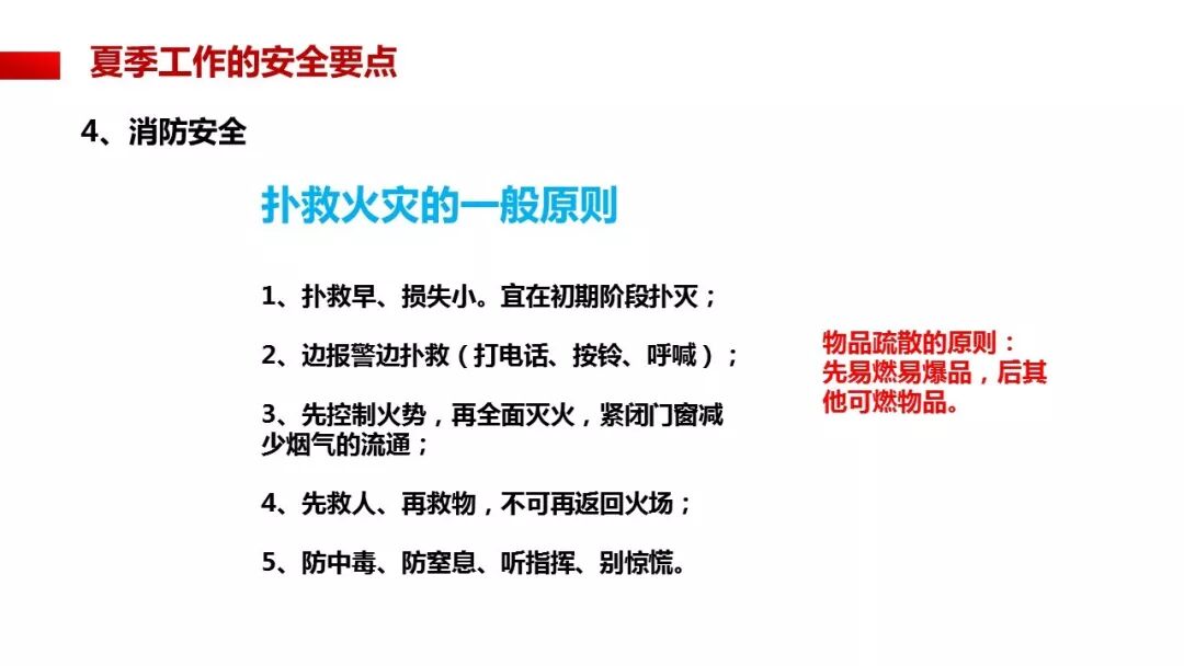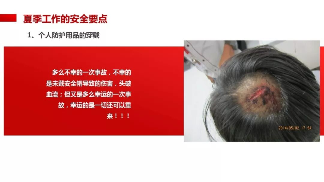 No.2 勞動保護: 天氣炎熱或因出汗等諸多原因,員工作業(yè)期間往往不規(guī)范穿戴長袖工作服、安全帽、防護手套、勞保鞋、防護面罩等防護用品。這些防護用品一般都是比較厚實的,天氣炎熱穿上這些東西會讓人覺得更熱,于是一些員工在工作過程中放棄了穿戴,一旦危險來臨連最基本的防護都沒有了,使得原本不是傷害很大的事故變得比較嚴重。各單位務必加強現(xiàn)場巡查和員工安全教育,為了保護好一線作業(yè)員工的人身安全,請穿戴好個人防護用品。 No.3 防電氣事故傷害: 1、由于夏季相對潮濕,加上人容易流汗等原因容易導致人體電阻率下降,往往是觸電事故多發(fā)期。各單位一定要認真做好所有用電設備的維護、保養(yǎng)和外殼接地檢測工作,特別要加強電氣線路的檢查,防止觸電事故的發(fā)生。 2、夏季是用電的高峰期,由于高溫、雷電和多雨等季節(jié)因素容易導致電器絕緣程度降低,加上用電負荷的增加,電線絕緣老化加速,使得電氣設備容易因發(fā)熱而發(fā)生火災。各單位一定要加強用電安全教育和管理工作,嚴禁私自亂拉亂接電源;注意線路的絕緣老化、電線裸露、負荷過重問題;下班時或離開工作崗位后,一定要關閉各設備電源,以防止電器設備因短路或發(fā)熱引起的火災事故。 No.4 防疲勞作業(yè): 夏天,溫度高,勞動強度加大,加上白晝時間長,員工容易出現(xiàn)困倦、過度疲勞的狀況,容易發(fā)生事故。各單位要合理安排作業(yè)時間,要關注員工的身體狀況。 No.5 防火防爆: 火災爆炸事故不但影響企業(yè)的正常生產、造成設備損失,嚴重時還會造成嚴重的人員傷亡,其后果不堪設想。夏季天氣炎熱,溫度高,各類可燃物質極易揮發(fā),環(huán)境濃度容易達到爆炸極限,因此一定要做好易燃易爆物品的管理工作,所有接觸酒精、氫氣的崗位(酒精庫、濕磨崗位、還原崗位、噴霧干燥等)務必做好安全生產檢查工作。同時,各單位一定要做好設備的維護保養(yǎng)工作,要加強在用設備的巡檢,作好設備關鍵部位的測溫。特別要加強公司的41個重點安全要害崗位的風險防控,嚴格按照檢查表逐一對照檢查,將事故隱患杜絕于萌芽之中。 No.6 防檢修作業(yè)事故: 檢修作業(yè)前必須認真履行審批手續(xù)。檢修工作時按規(guī)定穿戴好勞動保護用品。應至少安排兩名工作人員參與。 檢修前,應切斷電源,并在電源處掛牌上鎖,安排專人看護,檢修完成前嚴禁打開電源。在防爆區(qū)域進行檢修時,注意防火防爆,安全使用防爆工具。檢修完畢后,應清點工具,防止工具留在機器內。 No.7 防雷雨: 雷擊可能造成設備或設施的損壞,造成大規(guī)模停電、停產,也可能引起火災爆炸,導致巨大經濟損失和人員傷害。夏季雷雨天氣增多,各單位務必要做好防雷設施的檢查保養(yǎng)工作,并加強對建筑設施、電器設備的防雷防靜電接地測試檢測,定期檢查,防范于未然。 No.8 防壓力容器爆炸: 一是要加強壓力容器的巡視檢查,確保安全附件(如壓力表、安全閥等)的有效可靠。二是要加強焊接作業(yè)監(jiān)護及氣瓶管理,嚴禁氣瓶在太陽下暴曬。夏天氣溫比較高,將氣瓶直接放置于露天,高壓氣體在烈日的照射下溫度上升,體積膨脹,嚴重的會發(fā)生氣瓶爆炸造成人員傷亡和財產損失。 No.9 防有限空間作業(yè)傷害: 夏季天氣炎熱,各種氣體更易揮發(fā),各單位進行有限空間作業(yè)時,要嚴格執(zhí)行作業(yè)票制度,做好有毒氣體和氧氣的檢測。特別是噴霧干燥人工清洗作業(yè),要堅持“先通風,后檢測,再作業(yè)”,并做好作業(yè)人員的安全防護和作業(yè)全程監(jiān)護工作,防止作業(yè)人員缺氧窒息,務必嚴防有限空間作業(yè)事故的發(fā)生。 No.10 防人身傷害: 夏季生產過程中,操作人員容易因為疲倦而導致應變能力變差,自我保護能力下降;長期處于炎熱環(huán)境中時,更容易使人心情煩躁,表現(xiàn)在作業(yè)現(xiàn)場中就是違章作業(yè)現(xiàn)象普遍增多。員工心情煩躁時,往往會精力不集中,作業(yè)時容易走神,極易引發(fā)工傷事故。各單位一定要把握好員工的思想情緒,保證好員工的休息時間,注意防止員工因天氣炎熱造成心緒煩躁、注意力不集中、違章蠻干而導致發(fā)生安全事故。