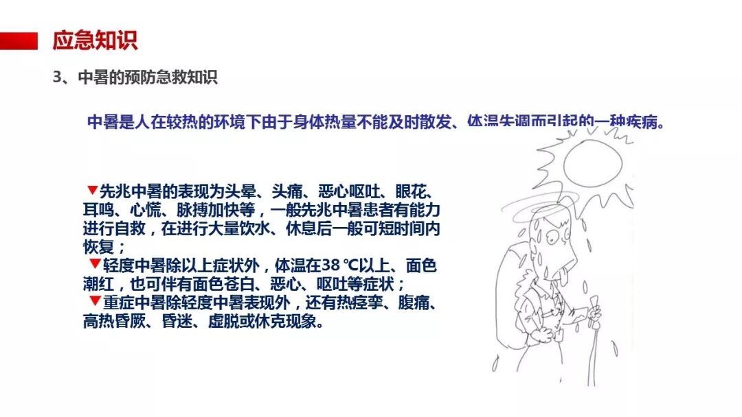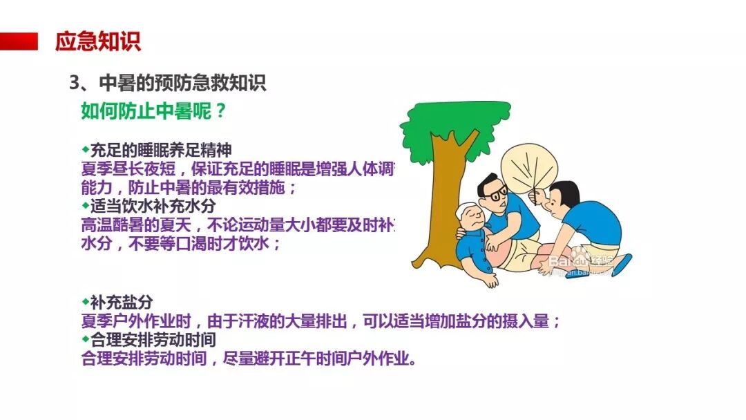 夏季天氣炎熱,由于熱不斷作用于人體,體內熱量散發(fā)困難,使體內蓄熱過多而引起頭痛、頭暈、體溫升高、惡心、嘔吐等癥狀,這就叫中暑。中暑嚴重時,還會造成暈倒,如不及時急救甚至有生命危險。南方的夏季溫度高,濕度較大極易發(fā)生中暑,各單位應切實做好員工的防暑降溫工作,合理安排員工的作息時間,盡量避開高溫時段作業(yè),并配備好藿香正氣水、涼茶等防暑用品,創(chuàng)造良好的工作休息環(huán)境,做到勞逸結合,保障身體健康。