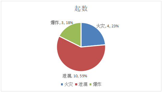 (3)事故主要是泄漏事故,10起,占59%,其次是泄漏后導(dǎo)致的火災(zāi)事故,4起,占23%,第三是泄漏后導(dǎo)致的爆炸事故,3起,占18%。