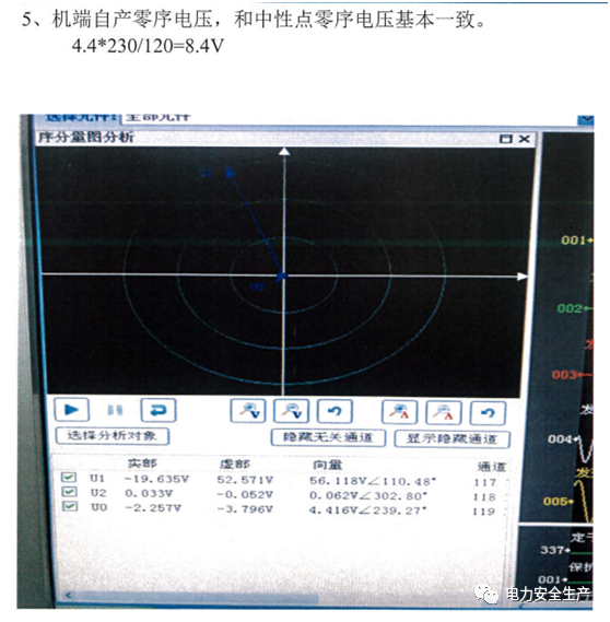23時(shí)31分19秒,零序電壓從0.12V開始上升,至23時(shí)31分57秒上升至8.2V,在此過(guò)程中機(jī)端A、B兩相電壓逐漸降低至54V,C相電壓逐漸提高至60V。