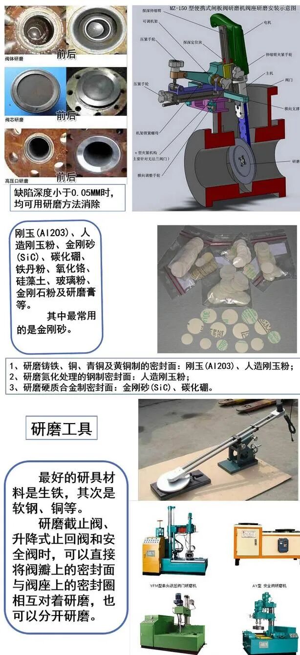 閥門在安裝和使用過(guò)程中,由于制造質(zhì)量和磨損等原因,使閥門容易產(chǎn)生泄漏和關(guān)閉不嚴(yán)等現(xiàn)象。3.關(guān)不住或關(guān)不嚴(yán)(1)關(guān)不嚴(yán):可能是由于閥座與閥芯之間卡有臟物,或是閥座、閥芯有被劃傷之處,致使閥門無(wú)法關(guān)嚴(yán)。(2)關(guān)不?。菏窃陂_啟閥門時(shí),用力過(guò)猛而開過(guò)了頭。潤(rùn)滑劑:對(duì)不同的研磨工具,要求使用不同的潤(rùn)滑劑。1、使用生鐵研磨工具時(shí),用煤油作潤(rùn)滑劑;2、使用軟鋼研磨工具時(shí),用機(jī)油;3、使用銅研磨工具時(shí),用機(jī)油、酒精或堿水堿水(堿水是天然堿,主要的成分是碳酸鈉和碳酸鉀)。