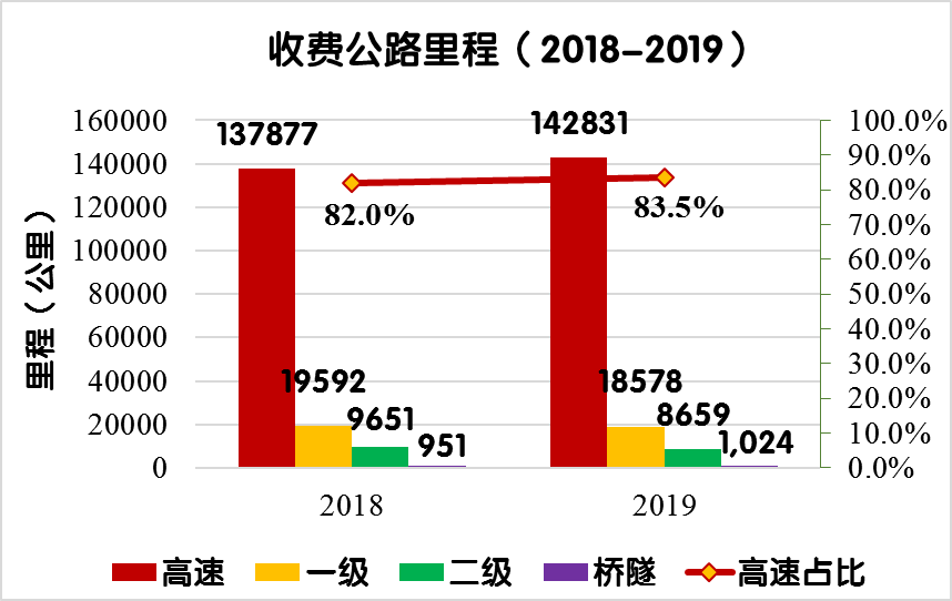 與上年末相比,經營性公路總里程由74814公里增加到77221公里,凈增2406 公里,增長3.2%。其中,高速公路里程由65299 公里增加到68373 公里,凈增3074 公里,增長4.7%;一級公路里程由4460公里減少到4147 公里,凈減314公里,下降7.0%;二級公路里程由4307公里減少到3862 公里,凈減444公里,下降10.3%;獨立橋梁及隧道里程由749公里增加到839公里,凈增90公里,增長12.0%。