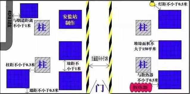 儲存物品與風(fēng)管、供暖管道、散熱器的距離不應(yīng)小于0.5米。與供暖機(jī)組、風(fēng)管爐、煙道之間的距離在各個(gè)方向上都不應(yīng)小于1米?!秱}儲場所消防安全管理通則》(GA1131-2014)6.14