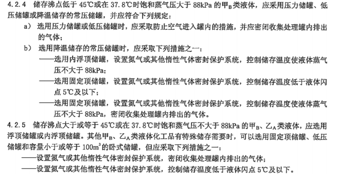 6.2.2條文解釋:對于有特殊要求的甲、乙液體物料,如苯乙烯、加氫原料、丙烯腈等易聚合、易氧化或有毒的液體物料,選用固定頂儲罐或臥式儲罐加氮封儲存也是可行的;