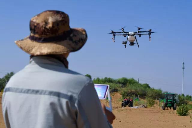 ↑這是內蒙古鄂爾多斯市杭錦旗庫布其沙漠中的生態(tài)修復景觀(2018年7月11日無人機拍攝)