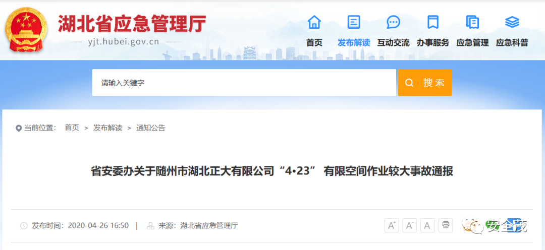 湖北“4.23”有限空間作業(yè)較大事故通報