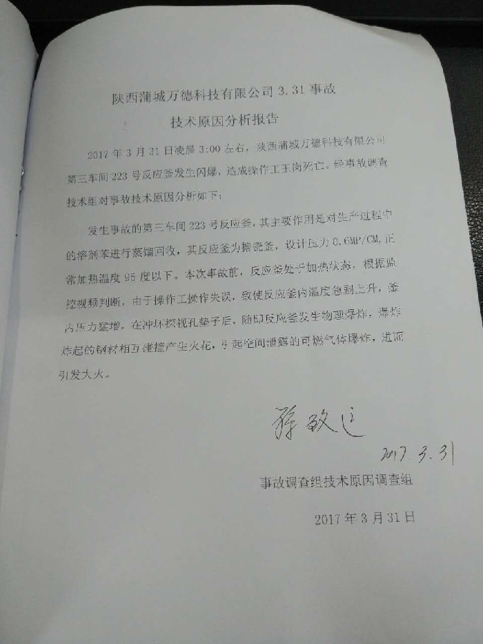 2017年3月31日凌晨3:00左右,蒲城萬德科技有限公司第三車間223反應(yīng)釜發(fā)生閃爆,引發(fā)第三車間著火,造成一起1名夜班工人死亡。依據(jù)《安全生產(chǎn)法》、《生產(chǎn)安全事故報(bào)告和調(diào)查處理?xiàng)l例》等法律法規(guī)的規(guī)定,縣政府成立了蒲城萬德科技有限公司“3.31”生產(chǎn)安全事故調(diào)查組開展事故調(diào)查。并聘請(qǐng)了相關(guān)?;瘜<覅⑴c調(diào)查。調(diào)查組經(jīng)過現(xiàn)場(chǎng)勘查、調(diào)查取證、專家論證和綜合分析,查明了事故發(fā)生的經(jīng)過、原因、人員傷亡和直接經(jīng)濟(jì)損失等情況,認(rèn)定了事故的性質(zhì)和責(zé)任,提出了事故防范及整頓措施的建議,現(xiàn)將事故調(diào)查報(bào)告如下: