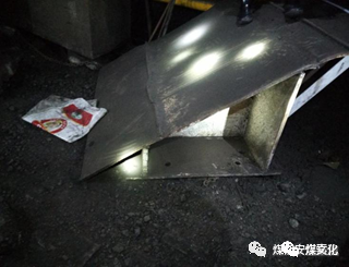 事故地點(diǎn)位于Z14-2W01綜采工作面回風(fēng)順槽,距工作面23.5m超前支架處。 事故發(fā)生地點(diǎn)的超前支架已卸載,頂梁距離頂板最小距離0.7m,最大距離1.6m,超前支架底座前2.5m處有從支架頂部滑落的三角形斜梁,長1.82m,寬1.5m,高0.7m,重約900kg,三角形斜梁底座有焊印,支架頂梁上無螺栓孔,支架與三角形斜梁靠上幫處有一鐵質(zhì)工具箱(見圖2);Z14-2W01綜采工作面存在19.1㎡的空頂范圍。其余詳見《現(xiàn)場勘查報告》。