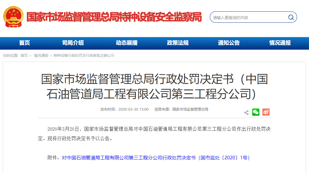 按照《特種設(shè)備安全監(jiān)察條例》第八十二條,總局決定撤銷中國(guó)石油管道局工程有限公司第三工程分公司的GA1甲、GB1、GB2、GC1級(jí)壓力管道安裝許可證。