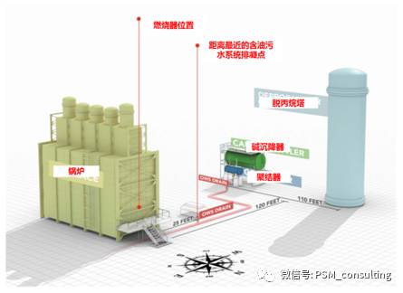 CSB調(diào)查組認(rèn)為,在維護作業(yè)準(zhǔn)備活動過程中脫丙烷塔內(nèi)的烴類物料很可能通過發(fā)生泄漏的聚結(jié)器100mm出口閥進入了聚結(jié)器和堿沉降器中。當(dāng)晚班操作人員開始將容器內(nèi)物料排放至含油污水系統(tǒng)時,一個位于堿沉降器東側(cè)約37m的鍋爐很可能是引燃烴類物料的點火源,如圖6所示。當(dāng)烷基化裝置操作人員擴大隔離范圍(包括聚結(jié)器和堿沉降器),只關(guān)閉了位于脫丙烷塔和計劃隔離設(shè)備之間的一個閥門。