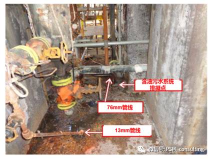 2015年11月29日,剛過換班時間,夜班操作人員與白班操作人員關(guān)于維護準(zhǔn)備工作情況進行了溝通,并檢查了白班操作人員手寫的作業(yè)過程列表,同時還確認(rèn)了哪個設(shè)備已經(jīng)被隔離。夜班操作人員獨自進行設(shè)備準(zhǔn)備任務(wù)的下一步工作,把第二次充裝的冷凝水從容器內(nèi)排空。下午6:00左右,夜班操作人員打開排凝閥,繼續(xù)排空設(shè)備,把攜帶的冷凝水排入含油污水系統(tǒng)。就在他剛打開去含油污水系統(tǒng)的76mm排凝閥時(如圖3所示),突然看到一團火焰向他撲來,閃火造成夜班操作人員的面部和頸部二級燒傷,手腕處三級燒傷。他立即離開該區(qū)域,并啟動了固定式消防設(shè)備。