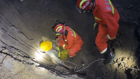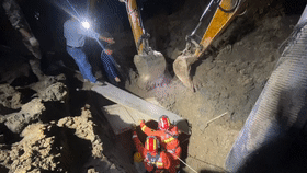 消防員做好安全防護(hù)后,找來木板對(duì)周邊土壤進(jìn)行固定,防止二次坍塌,并利用挖掘機(jī)一點(diǎn)一點(diǎn)地挖掘一側(cè)土壤,擴(kuò)大救援空間。