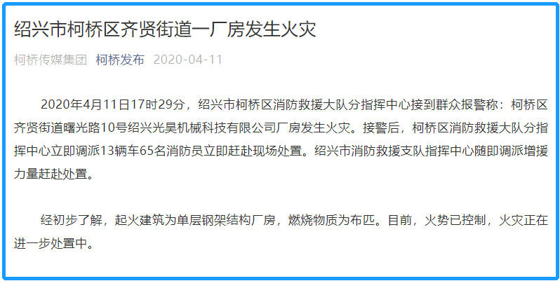 據(jù)媒體報道稱:2020年4月11日17時29分,紹興市柯橋區(qū)齊賢街道曙光路10號紹興光昊機械科技有限公司廠房發(fā)生火災!現(xiàn)場火光沖天,廠房內(nèi)可燃物化為灰燼。