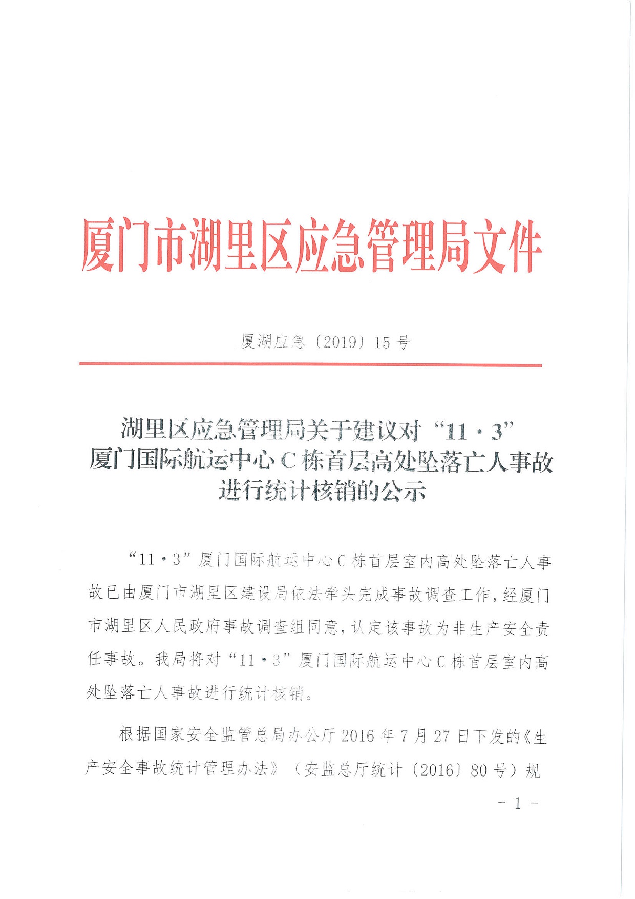 湖里區(qū)應(yīng)急管理局關(guān)于建議對“11·3”廈門國際航運中心C棟首層高處墜落亡人事故進行統(tǒng)計核銷的公示