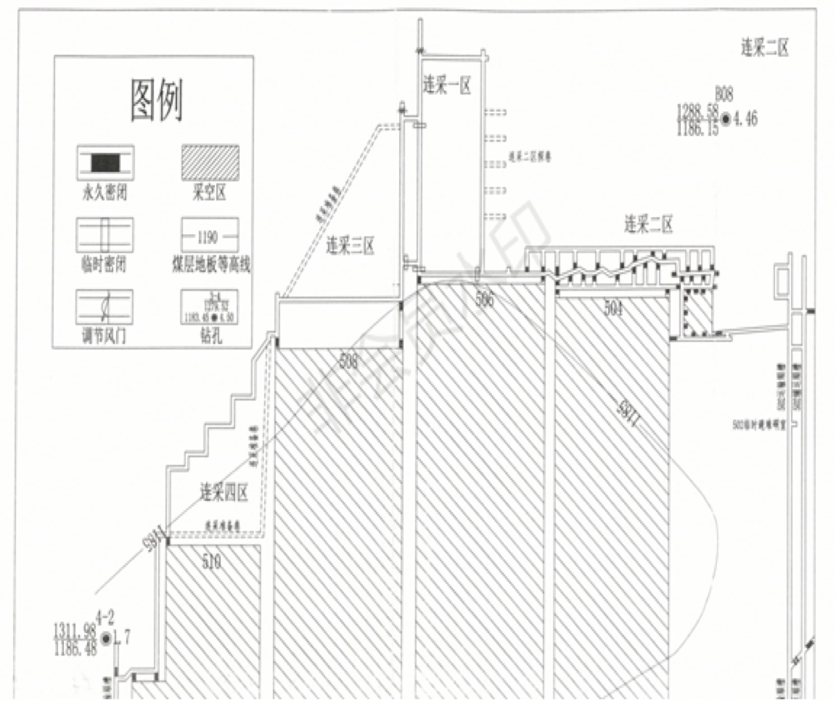 連采二區(qū)的開采,沒有單獨編制工作面設(shè)計和作業(yè)規(guī)程,《5-1煤南翼連續(xù)采煤機短壁回采一區(qū)作業(yè)規(guī)程》中也沒有包含開采連采二區(qū)的內(nèi)容。2018年12月初,連采隊從506進風(fēng)順槽與二支巷交叉口處向西南掘進到11.4米時,與老空打通,采用紅磚壘砌臨時密閉封堵。2019年1月11日夜班,在二支巷回采了3個采硐后,從506進風(fēng)順槽與三支巷交叉口處,垂直于506進風(fēng)順槽向西南方向掘進至41.2米處。