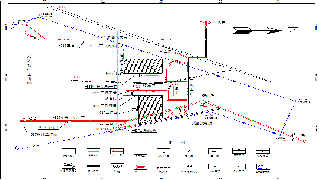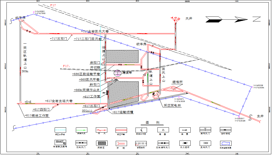 2.主要生產(chǎn)系統(tǒng)。礦井采用平硐上下山開拓,單水平布置。主平硐井口標高+612.73m,副井井口標高+761.70m,風井井口標高+758.94m。水平標高為+617m,劃分為4個采區(qū)。其中,+617m水平以上設置Ⅰ、Ⅱ2個采區(qū),+617m水平以下設置Ⅲ、Ⅳ2個采區(qū)(見圖1)。礦井主平硐采用CTY2.5-GGB型蓄電池電機車運輸;通風方式為中央邊界抽出式通風,風井安裝2臺FBCZ-6-№12防爆抽出式通風機,掘進工作面采用局部通風機供風;礦井為單回路供電,配備100KVA柴油發(fā)電機作為備用電源,電壓等級為660V。礦井現(xiàn)生產(chǎn)區(qū)域位于礦區(qū)中部F17斷層以南的Ⅰ采區(qū)。受斷層影響,Ⅰ采區(qū)北部呈一狹長塊段,礦井將該塊段劃分出來,作為邊角煤采區(qū)進行獨立回采,即+617m采煤工作面,礦井編制了《邊角煤采區(qū)設計》。
