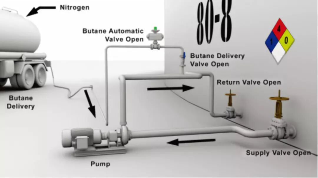 丁烷通過固定的丁烷噴射系統(tǒng),通過槽罐車運輸,被注入到80-8儲罐中。丁烷噴射系統(tǒng)起始于罐區(qū)西南方向的罐車裝載架上,在循環(huán)管路(管匯)80-8罐區(qū)的一個噴射點處終止。這種控制系統(tǒng)的設計,使丁烷注入操作無法啟動,除非80-8儲罐的泵處于開啟狀態(tài)確保罐內介質正在流動。當這個條件被滿足時,ITC操作員可以通過按下罐車裝載架上的ON按鈕來打開執(zhí)行器閥門,讓丁烷開始卸貨。丁烷從罐車上卸下,經(jīng)過4英寸的管道,再由2英寸的管道流入產(chǎn)品循環(huán)管線,與原有的石腦油產(chǎn)品相混合。為了便于石腦油和丁烷的混合(圖4),泵在整個卸載過程中以及之后的幾個小時內都處于開啟狀態(tài)。