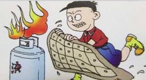 ● 遇到煤氣泄漏或輸出管著火時,應采取正確的滅火方法,可以用濕毛巾捂住口鼻進入室內(nèi),并用浸濕的棉被蓋住燃燒處后關閉閥門。