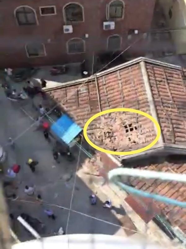 現(xiàn)場可以看到,該棟民宅的屋頂有四分之一的瓦片被毀,從隔壁的樓上往下看時,可以看見屋頂已經(jīng)出現(xiàn)一個大洞。