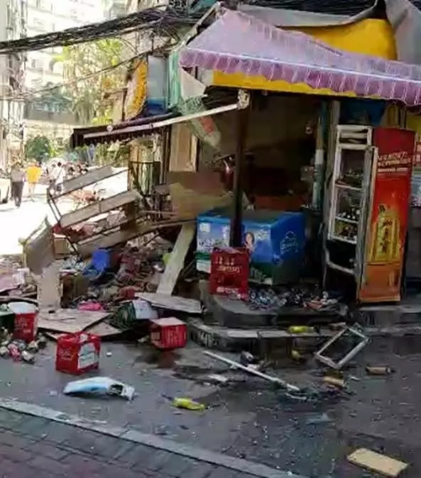 爆炸當(dāng)時(shí),士多店的墻塊、磚塊、雜物四下飛出,墻壁倒塌,甚至相隔數(shù)米之外的路邊樹葉也被震落下來,商鋪內(nèi)更是一片狼藉。